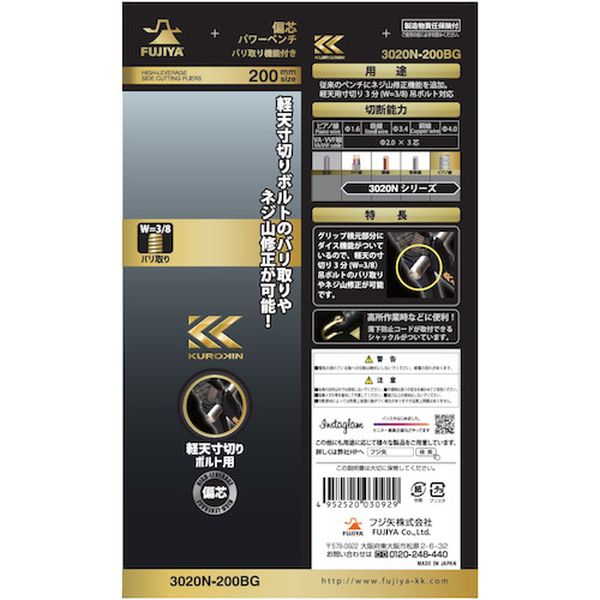 ・偏芯テコ機能で従来品よりも軽く切断できます。・グリップ根元部分にダイス機能がついているので、軽天の寸切り3分(W=3/8)吊ボルトのバリ取りやネジ山修正が可能です。・軽量設計でワンサイズ下の重量を実現し、腰周りの負担を減らします。・ピアノ線の切断も可能です。・くわえ部の硬度、形状を変更し、耐久性と滑りにくさを実現しました。・落下防止用コード取付穴がついているので、高所作業でも安心です。・刃長が長くVA・VVF線2.0mm×3芯まで切断可能です。・製造時の使用電力の20%を太陽光発電で賄っています。・電気工事、設備、空調、配管工事などに。・全長(mm):202・切断能力(mm)鉄線:Φ3.4・切断能力(mm)銅線:Φ4.0・切断能力(mm)ピアノ線:Φ1.6・切断能力(mm)VA線(VVF):2.0×3芯・落下防止用ひも取付穴:有・ハンドル:樹脂・先端部ギザ付・バリ取り機能・ネジ山修正機能付(軽天用寸切り3分(W=3/8)吊ボルト対応)・特殊鋼・グリップ:樹脂・本来の目的以外では使用しないでください。・能力以上の使用はしないでください。・作業時は周りの安全を確かめてご使用ください。・保護メガネ等を着用して作業をしてください。・切断部材によっては性質上表面に跡がつく場合がありますが、品質上問題はありません。・生産国 日本・JANコード 4952520030929・質量 270g・コード:240-2226 ・品目:3020N200BG