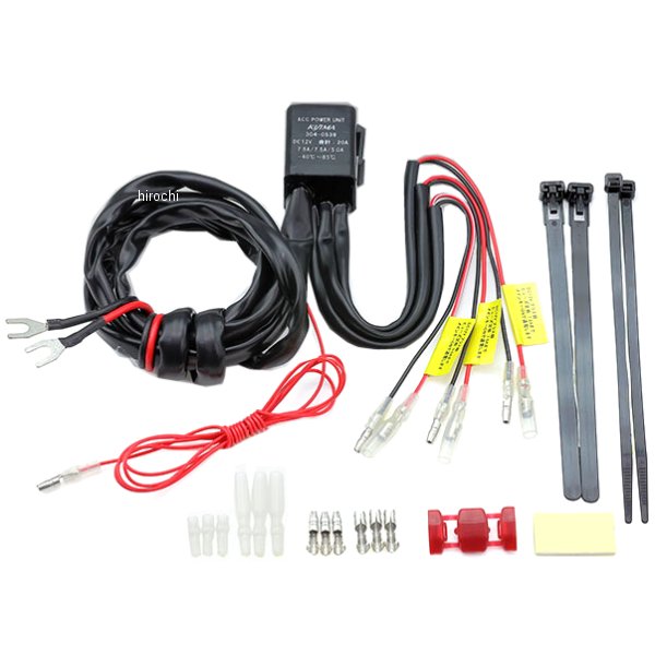 キジマ アクセサリーパワーユニットDC12V車サイズ:42mm×31mm×25mm【電流】合計20A(最大) 7.5A(定格)×2系統・5A(定格)×1系統(実使用上の推奨電流は 4.0A×2系統・2.5A×1系統です)【付属品】ユニット本体×1・エレクトロタップ×1・両面テープ×1・結束バンド×2・リリース式結束バンド×2・Φ4.0ギボシ端子(CA/CB104)【ハーネス長】電源用:約1300mm/出力用:約280mm【仕様説明】本製品はUSB充電器やドライブレコーダー、グリップヒーター、ナビ等の電装品を車体に装着したい時に、3系統のアクセサリーを直接バッテリーから簡単に取り出すことが出来るパワーユニットです。メインキー連動でON/OFF可能なため無駄な電力を消費しません。車体の空きスペースにも納まるコンパクトなボディ設計です。本体ユニットは防水仕様なので雨にも強い構造となっております。(接続端子部分は非防水です。水がかからないように設置してください)【注意事項】(1)本製品はDC12V車用の汎用品です。車両の仕様や電装品の仕様によってはご使用できない場合がございます。ご使用される電装品の誤動作や故障等の保証はできかねます。一部、エンジン始動時に電圧等をECUで感知してから、エンジンのかかる車両では、不具合が出る可能性があります。(2)本製品の合計最大電流は20Aです。最大許容電流は、定格7.5A×2・定格5A×1となります。(推奨電流は4.0A×2・2.5A×1の3系統となります。ご使用の電装品の最大電流及び仕様及び車両側のバッテリーの仕様をご確認の上、ご使用下さい。車両のバッテリー及び発電能力以上の出力はされません。(3)本製品の接続部は、CA/CB104ギボシ(4.0mm)を使用しております。配線加工は着実に配線の被服を向きギボシ端子に電工ペンチ等で着実に圧着して下さい。ギボシ端子の接続も確実に接続して下さい。(4)本体ユニット部は、防水仕様です。接続部分でショートしない様に取付け箇所にご注意下さい。保護回路以上の過電流が流れた場合に故障する場合がある為、本製品は保護回路機能(PTCサーミスタ)を内蔵しております。ショート等させた場合、一時的に回路を遮断します。(5)ショートや過電流やサージで、本体が電流を遮断した場合、数秒間放置し本体ユニット部を冷やす事で回路が回復します。ショート等の原因を特定し改善して下さい。原因を放置すると火災等が発生する場合があるのでご注意下さい。(6)PTCサーミスタは、電流の抵抗による熱量により電流を遮断します。保護回路が作動した場合には速やかに電装品を取外して下さい。そのままご使用されると本体の変形や溶解させる可能性があります。エンジン熱等で80℃以上になる場所への設置はしないで下さい。(7)エンジンを始動せず、電装品を使用し続けるとバッテリー上がりの原因になります。短い時間でチェックを行うか、エンジンをかけてご使用下さい。エンジン始動前は、電装品のスイッチを切っておく事をおすすめします。(8)バッテリー上がりや充電時にブースターケーブル及び急速バッテリー充電器を使用すると本体の溶断や故障する可能性がありますので、充電する際には、本体ユニットのバッテリー接続部を外して充電する事をお勧めします。(9)本製品をご使用して、電装品を多くご使用するとバッテリーが消耗します。冬場等で放電し続けるとバッテリーが上がりますので、日頃のメンテナンス及び電圧管理を行って下さい。リチウムイオンバッテリーは、仕様で一定の電圧以下になると充電が不十分になる可能性がある為、仕様をご確認の上ご使用下さい。(10)取付けには、テスターを使用してチェック作業を行いながら作業を行って下さい。(11)機器を接続しないマイナス線のギボシ端子と鉄部分が触れるとショートする為、必ずビニールテープ等で絶縁処理を行って下さい。(12)上記を守った上で、本体が遮断する場合には、使用する電装品を選定するか、別の場所に電装品の接続を移設してご使用下さい。(13)作業中は、必ずメインキーをOFFにして下さい。メインキーをONのまま配線の抜き差しをしないで下さい。ショート等により機器の故障する可能性があります。作業中に車体が倒れたりして危険ですので、作業は水平な場所で車体を安定させて行って下さい。