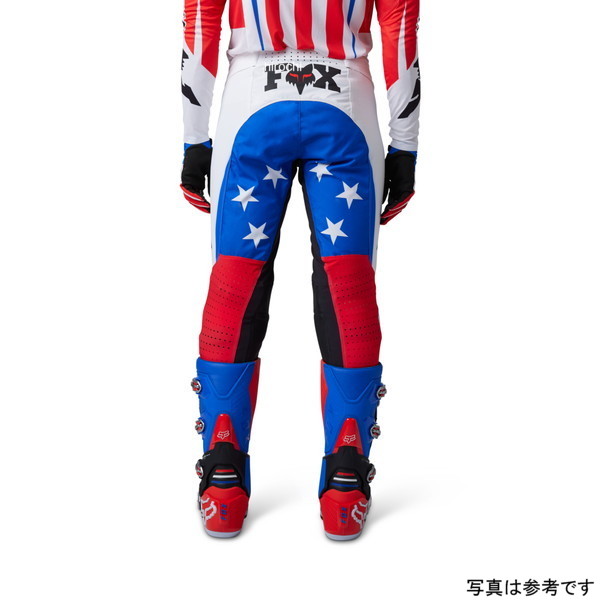 -ユニティリミテッドコレクションは2023年7月アメリカのモトクロス・トラックであるRedBud(レッドバッド)にて開催されるAMAモトクロスで初披露されたコレクション。アメリカン・モトクロスとフォックスレーシングの長く輝かしい歴史に敬意を表した赤、白、青の3色 をベースにデザイン。フレックスエアーパンツは世界のトップモトクロスアスリートたちによって最も過酷なコンディションのレースでテストされ開発されたプレミアムモトクロスパンツ。・超軽量で柔軟な4方向ストレッチ素材を使用し、ライディング時の動きに適応する。・オフロードバイクでの最適な乗車姿勢を想定し、膝はカーブしたデザインで立体裁断され、あらゆる動きにもストレスやつっぱり感などがなく快適な着心地を提供。・膝回りはスリムなフィッティングながらストレッチ素材により膝プロテクターとの同時着用においても着用時の煩わしさなどなくすっきりとした見た目をキープ。・ひざ内側はフルグレインレザーと摩耗に強い生地の2重構造とすることで、バイクへのニーグリップの際や膝プロテクターとの同時着用においても確かな耐久力を発揮。・着用時の快適性と軽量化を目的とし、インナーメッシュライナーは摩耗の激しい着座部のみに装備。・摩耗が激しい着座部には耐久性の高い600デニールの生地を使用。・大腿部と膝裏にはレーザーパンチ加工を施し、通気性を確保。