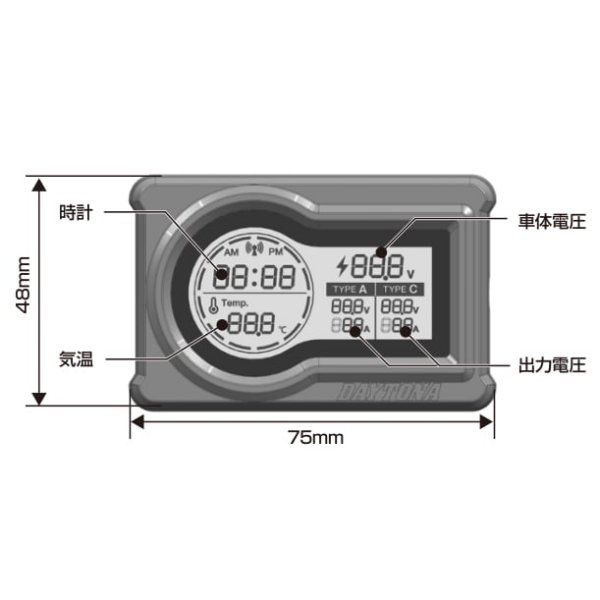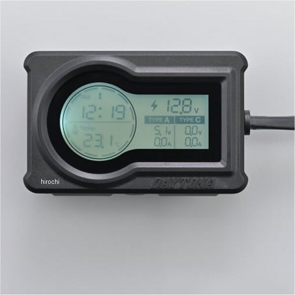 デイトナ マルチメーター&USB電源 タイプA+タイプC本体サイズ:H48×W75×D27mm【商品構成】ユニット本体 ×1ハーネス(ミニガラス管ヒューズ Φ5.2×20mm/250V 5A)×1両面テープ ×1結線コネクター ×1結束バンド ×2[ 複数機能をLCDモニターに集約 ]個別に装備すると乱雑になりがちな装備を1台に集約することでスマートに収めることができます。[ 急速充電対応 ]急速充電規格対応で1ポートあたり最大18W(5V/3A、9V/2A、12V/1.5A)出力可能。[ 見やすいデジタル表示 ]電波時計/気温/入力電圧/出力電圧電流を常に表示。電圧低下(11.8V以下)やスマホへの充電状況がわかる。