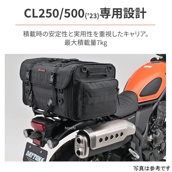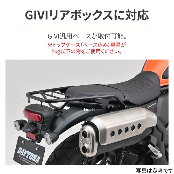 デイトナ グラブバーキャリア23年 ホンダ CL250 [8BK-MC57]23年 ホンダ CL500 [8BL-PC68]【仕様説明】タンデムシートとキャリアの上面を揃え大きな荷物も積載できるキャリアシートサイドまでパイプを回り込ませることで荷物が安定GIVIリアボックスの装着に対応しモノロックの汎用ベースが取付可能(ベース込みのBOX重量が5kgまで)サドルバックサポート(品番:97936)の同