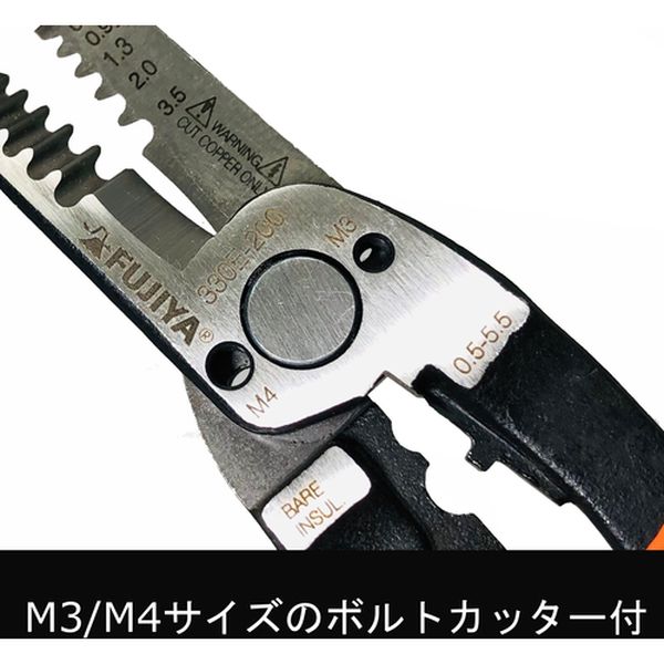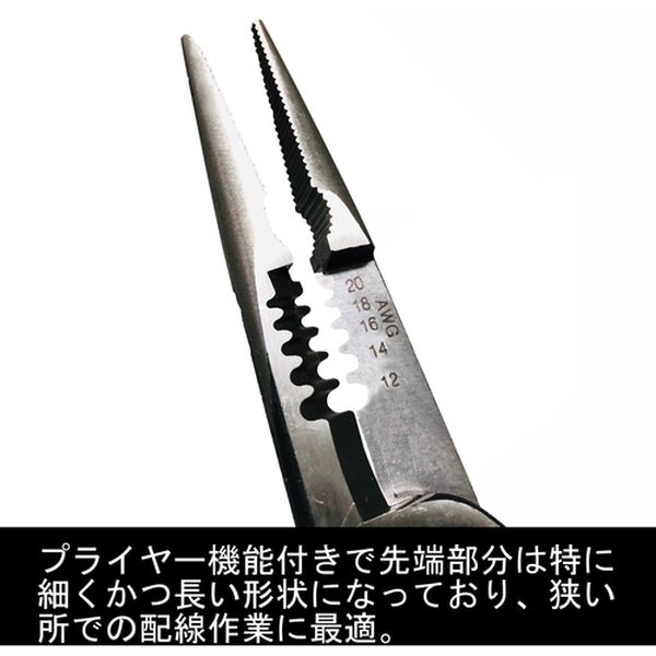 ・ラジオペンチの機能にストリッパー機能を追加しました。0.5~3.5mmサイズの線材のストリップが可能です。・先端部分は特に細かくかつ長い形状に加工しておりますので、狭い場所での配線作業に便利です。・グリップは狭い場所でも使いやすいよう、人間工学に基づき設計されたエルゴグリップを採用しております。・M3、M4サイズのボルトカッター付です。・裸端子、絶縁端子(0.9~5.5mm[[の2乗]])の簡易圧着が可能です。・くわえ部は掴んだ物が滑りにくいギザ付形状になっております。・くわえ部根元には、プライヤーとしてもお使い頂けるよう、大きめのギザ付形状になっております。・自動車整備や配電盤工事など。・全長(mm):185・落下防止用ひも取付穴:なし・皮むき能力([[MM2]]):0.5~3.5mm・圧着機能:簡易圧着機能有・ばね:無・ハンドル:2重ディッピング・先端部ギザ:有・エルゴグリップタイプ・ストリップ機能付・ボルトカット機能付(M3・M4)・圧着機能付(0.5~5.5mm[[の2乗]])・特殊鋼・グリップ:樹脂・電気の流れている物への切断は絶対にしないでください。感電の恐れがあります。・本来の目的以外では使用しないでください。・作業時は周りの安全を確かめてご使用ください。・保護メガネ等を着用して作業をしてください。・能力以上の使用はしないでください。・生産国 台湾・JANコード 4952520032183・質量 186g・コード:149-2503 ・品目:330E200