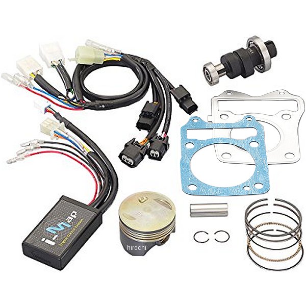 キタコ パワーパック125 バージョン213年-15年 ホンダ グロム16年 ホンダ グロムMSX125SF【仕様】・レース専用・ピストン:アルミ鍛造/二硫化モリブデンコート・ピストン径:φ52.4・圧縮比:12.2:1(ノーマル/9.3:1)・ハイカム:タイプ1・ハイオク仕様【付属品】・i-map インジェクションコントローラー・カプラーオンハーネス・ヘッドガスケット、パッキン類付属初期なじみに優れたモリブデンコート仕上げ125ccのままで高出力化が可能なハイコンプピストン、ハイカムシャフト、燃料噴射量をコントロールするI-MAPがワンセットになったコンプリートキット。ノーマルと比較にならないパワーを搾り出せます。安定した性能を発揮させるため、別途マフラーの交換が必要です。また、ピストン、ガスケットのみがセットになったハイコンプピストンキットも設定しています。初期馴染み向上。排気量はそのまま圧縮比を高め、エンジン出力アップ圧縮(9.3:1→12.2:1)を高め、エンジンの出力の向上を図ります。【1:ピストンの形状比較】・ピストンはアルミ鍛造を採用し、ノーマルの鋳造品と比べると高い強度と熱伝導性を備え、初期馴染み向上のため二硫化モリブデンコートを施しています。【2:i-map(グロム Ver.2)が配線加工なしで組付が簡単】・キットに付属のカプラーオンハーネスで繋げるだけ。・煩わしかった配線加工が無くなり簡単に i-map を組み付けることができます。【3:ハイカムシャフト タイプ1/2 の特徴】・ハイカムシャフト タイプ1:中回転域でのパワーの盛り上がりを重視・ハイカムシャフト タイプ2:高回転域でのパワーの盛り上がりを重視・ハイコンプピストンとハイカムシャフト タイプ1/2 の併用によって、高出力化が実現