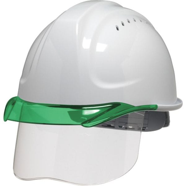 ・発泡スチロールに変わり樹脂製の衝撃吸収ライナーを採用しました。・ヘルメット内部に空間が広がり、衝撃吸収性能はそのままに格段に通気性が向上しました。・発泡ライナー装着時と比べ温度差ー8℃を実現しました。・柔らかくかぶり心地の良いテープ内装です。・飛来・落下物・墜落時保護用。・帽体色:ホワイト・バイザー色:グリーン・シールド色:クリア・頭囲(cm):55.5~60・衝撃吸収ライナー:有・墜落時保護用:〇・タイプ:テープ内装・通気孔:有・樹脂製衝撃吸収ライナー「エアロメッシュ」装着、シールド付・国家検定合格品・帽体:ABS樹脂・バイザー・シールド:ポリカーボネート(PC)・電気工事では使用できません。・生産国 日本・JANコード 4580118333338・質量 485g・コード:361-1143 ・品目:SYACSVSFEMKPWG