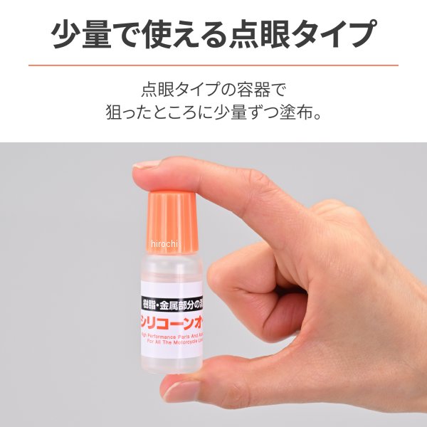 デイトナ シリコーンオイル 10ml【仕様説明】シリコーン100%で素材を傷めず潤滑できる使い切りやすい少量サイズ。石油系溶剤を不使用でプラスチック(樹脂)に使っても悪影響なし。動きが悪くなった樹脂パーツや金属部品の可動部に使用できます。点眼タイプの容器で、狙ったところに少量ずつ塗布が可能です。使い切りやすい10ml。非危険物。