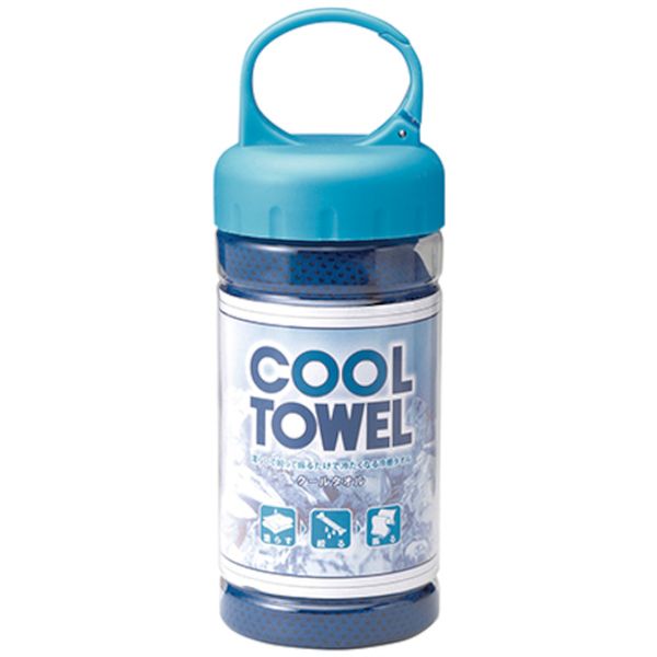 ・水に濡らして絞って振るだけで、気化熱効果により心地よい冷たさへとクールダウンする冷感タオルです。・カラビナ付きで持ち運びに便利です。・熱中症予防対策に。・色:ブルー・タオルサイズ(mm):300×950・ボトルサイズ直径(mm):66・ボトルサイズ高さ(mm):180・洗濯可/陰干し・タオル:ポリエステル・ボトル:プラスチック・生産国 台湾・JANコード 4932134237402・質量 106g・コード:259-0738 ・品目:375670