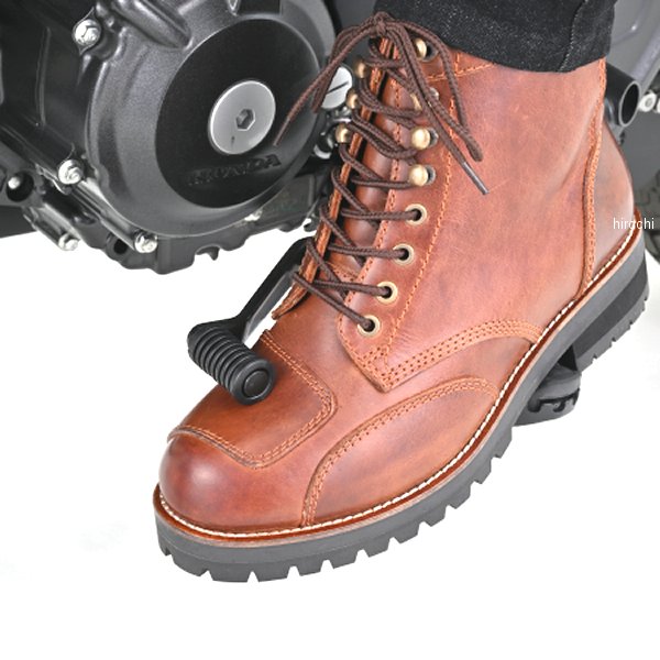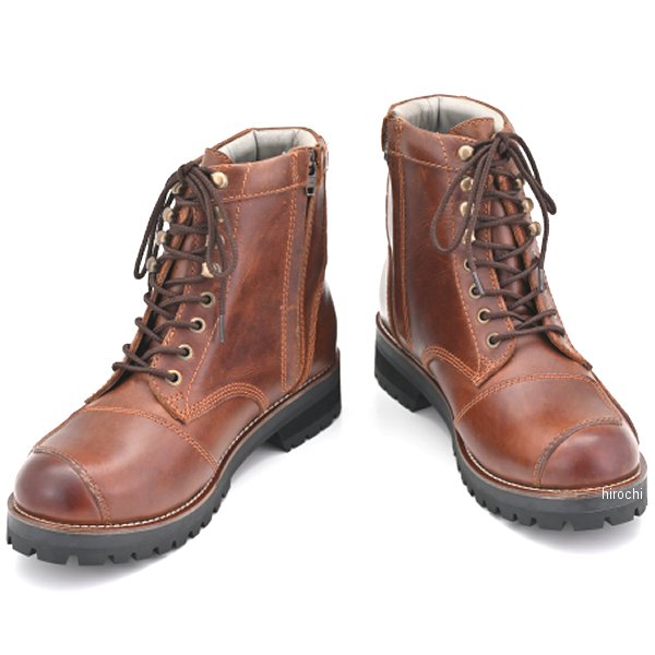 デイトナ DS-001 ダービーライドブーツ ブラウン 26.0cmサイズ:26.0cmカラー:ブラウンMaxFritzの佐藤氏が監修。4ホール、4フックのレースアップショートブーツ。2mm以上の厚みのあるフルグレインレザーを厳選。デイトナのレザーブーツで一番上質な牛革を採用しました。今回採用した牛オイルプルアップレザーは、一般的なオイルレザーよりもさらに多くのオイルを染み込ませて作られたレザーです。深くまで染み込んだ多量のオイルにより、革が柔らかく耐久性を高めます。また撥水性が高いことも特徴の一つです。折り曲げたりすると革内部の油分が繊維の中を移動し、その部分だけ色が薄く変化。色の変化から立体感のあるエイジングが楽しめます。E相当のワイズで細身のシルエット。スッキリと見えるブーツに仕上げました。見た目のバランスを考えて少し厚めのアウトソールを採用。細身のシルエットに厚めのソールがレザーブーツらしい重厚感を演出します。安全面ではブーツのくるぶし部分にパッドを内蔵しているため、見た目を損なわずに足を保護。履き口に配置した厚手のクッションがブーツとの擦れを軽減し、履き心地を良くします。シフトパッドは左右シンメトリーで配置し、シフトチェンジによるブーツへのダメージと足へのショックを和らげます。ソールは土踏まず部分に滑り止め加工を施し、ステップとのグリップ力を発揮。YKKのロックファスナーを使用したサイドジップでブーツの脱ぎ履きが楽になります。シュータンを袋状にすることで、紐の隙間から雨が入りにくい仕様にしました。※23.0-24.5cmはレディースサイズです。※防水機能はありません。