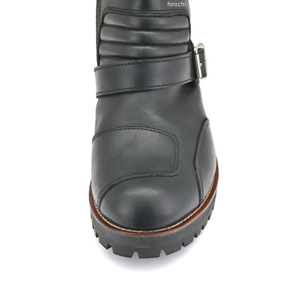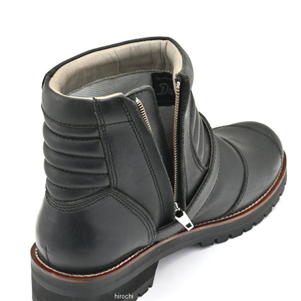 デイトナ DS-002 シャーリングライドブーツ ブラック 25.0cmサイズ:25.0cmカラー:ブラックMaxFritzの佐藤氏が監修。レーシングブーツからインスパイアされたショートブーツ。前後の足の動きをサポートするようにシャーリングを入れ、厚みのあるレザーでも動きやすく設計。2mm以上の厚みのあるフルグレインレザーを厳選。デイトナのレザーブーツで一番上質な牛革を採用しました。今回採用した牛オイルプルアップレザーは、一般的なオイルレザーよりもさらに多くのオイルを染み込ませて作られたレザーです。深くまで染み込んだ多量のオイルにより、革が柔らかく耐久性を高めます。また撥水性が高いことも特徴の一つです。折り曲げたりすると革内部の油分が繊維の中を移動し、その部分だけ色が薄く変化。色の変化から立体感のあるエイジングが楽しめます。E相当のワイズで細身のシルエット。スッキリと見えるブーツに仕上げました。見た目のバランスを考えて少し厚めのアウトソールを採用。細身のシルエットに厚めのソールがレザーブーツらしい重厚感を演出します。履き口に配置した厚手のクッションがブーツとの擦れを軽減し、履き心地を良くします。シフトパッドは左右シンメトリーで配置し、シフトチェンジによるブーツへのダメージと足へのショックを和らげます。ソールは土踏まず部分に滑り止め加工を施し、ステップとのグリップ力を発揮。YKKのロックファスナーを使用したサイドジップでブーツの脱ぎ履きが楽になります。※23.0-24.5cmはレディースサイズです。※防水機能はありません。