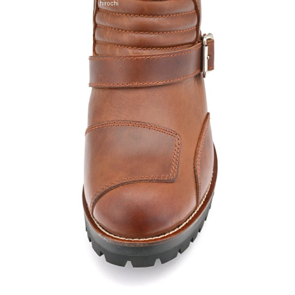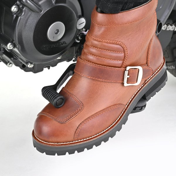 デイトナ DS-002 シャーリングライドブーツ ブラウン 26.0cmサイズ:26.0cmカラー:ブラウンMaxFritzの佐藤氏が監修。レーシングブーツからインスパイアされたショートブーツ。前後の足の動きをサポートするようにシャーリングを入れ、厚みのあるレザーでも動きやすく設計。2mm以上の厚みのあるフルグレインレザーを厳選。デイトナのレザーブーツで一番上質な牛革を採用しました。今回採用した牛オイルプルアップレザーは、一般的なオイルレザーよりもさらに多くのオイルを染み込ませて作られたレザーです。深くまで染み込んだ多量のオイルにより、革が柔らかく耐久性を高めます。また撥水性が高いことも特徴の一つです。折り曲げたりすると革内部の油分が繊維の中を移動し、その部分だけ色が薄く変化。色の変化から立体感のあるエイジングが楽しめます。E相当のワイズで細身のシルエット。スッキリと見えるブーツに仕上げました。見た目のバランスを考えて少し厚めのアウトソールを採用。細身のシルエットに厚めのソールがレザーブーツらしい重厚感を演出します。履き口に配置した厚手のクッションがブーツとの擦れを軽減し、履き心地を良くします。シフトパッドは左右シンメトリーで配置し、シフトチェンジによるブーツへのダメージと足へのショックを和らげます。ソールは土踏まず部分に滑り止め加工を施し、ステップとのグリップ力を発揮。YKKのロックファスナーを使用したサイドジップでブーツの脱ぎ履きが楽になります。※23.0-24.5cmはレディースサイズです。※防水機能はありません。