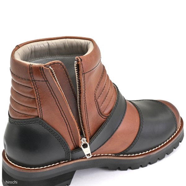 デイトナ DS-002 シャーリングライドブーツ コンビ 25.5cmサイズ:25.5cmカラー:コンビMaxFritzの佐藤氏が監修。レーシングブーツからインスパイアされたショートブーツ。前後の足の動きをサポートするようにシャーリングを入れ、厚みのあるレザーでも動きやすく設計。2mm以上の厚みのあるフルグレインレザーを厳選。デイトナのレザーブーツで一番上質な牛革を採用しました。今回採用した牛オイルプルアップレザーは、一般的なオイルレザーよりもさらに多くのオイルを染み込ませて作られたレザーです。深くまで染み込んだ多量のオイルにより、革が柔らかく耐久性を高めます。また撥水性が高いことも特徴の一つです。折り曲げたりすると革内部の油分が繊維の中を移動し、その部分だけ色が薄く変化。色の変化から立体感のあるエイジングが楽しめます。E相当のワイズで細身のシルエット。スッキリと見えるブーツに仕上げました。見た目のバランスを考えて少し厚めのアウトソールを採用。細身のシルエットに厚めのソールがレザーブーツらしい重厚感を演出します。履き口に配置した厚手のクッションがブーツとの擦れを軽減し、履き心地を良くします。シフトパッドは左右シンメトリーで配置し、シフトチェンジによるブーツへのダメージと足へのショックを和らげます。ソールは土踏まず部分に滑り止め加工を施し、ステップとのグリップ力を発揮。YKKのロックファスナーを使用したサイドジップでブーツの脱ぎ履きが楽になります。※23.0-24.5cmはレディースサイズです。※防水機能はありません。