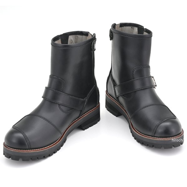 デイトナ DS-003 エンジニアブーツ ブラック 26.5cmサイズ:26.5cmカラー:ブラックMaxFritzの佐藤氏が監修。オーソドックスなエンジニアブーツ形状のショートタイプ。カジュアルでありながら履きやすい丈のバイク用ブーツ。横から見たデザインを重視し、ファスナーをヒール側に設置。2mm以上の厚みのあるフルグレインレザーを厳選。デイトナのレザーブーツで一番上質な牛革を採用しました。今回採用した牛オイルプルアップレザーは、一般的なオイルレザーよりもさらに多くのオイルを染み込ませて作られたレザーです。深くまで染み込んだ多量のオイルにより、革が柔らかく耐久性を高めます。また撥水性が高いことも特徴の一つです。折り曲げたりすると革内部の油分が繊維の中を移動し、その部分だけ色が薄く変化。色の変化から立体感のあるエイジングが楽しめます。E相当のワイズで細身のシルエット。スッキリと見えるブーツに仕上げました。見た目のバランスを考えて少し厚めのアウトソールを採用。細身のシルエットに厚めのソールがレザーブーツらしい重厚感を演出します。シフトパッドは左右シンメトリーで配置し、シフトチェンジによるブーツへのダメージと足へのショックを和らげます。ソールは土踏まず部分に滑り止め加工を施し、ステップとのグリップ力を発揮。YKKのロックファスナーをヒール側に設置。ブーツの脱ぎ履きが楽になります。※ 23.0-24.5cmはレディースサイズです。※ 防水機能はありません。