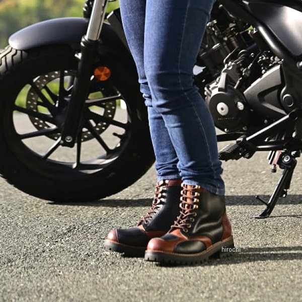 デイトナ DS-001 ダービーライドブーツ レディース コンビ 23.0cmサイズ:23.0cmカラー:コンビMaxFritzの佐藤氏が監修。4ホール、4フックのレースアップショートブーツ。2mm以上の厚みのあるフルグレインレザーを厳選。デイトナのレザーブーツで一番上質な牛革を採用しました。今回採用した牛オイルプルアップレザーは、一般的なオイルレザーよりもさらに多くのオイルを染み込ませて作られたレザーです。深くまで染み込んだ多量のオイルにより、革が柔らかく耐久性を高めます。また撥水性が高いことも特徴の一つです。折り曲げたりすると革内部の油分が繊維の中を移動し、その部分だけ色が薄く変化。色の変化から立体感のあるエイジングが楽しめます。E相当のワイズで細身のシルエット。スッキリと見えるブーツに仕上げました。見た目のバランスを考えて少し厚めのアウトソールを採用。細身のシルエットに厚めのソールがレザーブーツらしい重厚感を演出します。安全面ではブーツのくるぶし部分にパッドを内蔵しているため、見た目を損なわずに足を保護。履き口に配置した厚手のクッションがブーツとの擦れを軽減し、履き心地を良くします。シフトパッドは左右シンメトリーで配置し、シフトチェンジによるブーツへのダメージと足へのショックを和らげます。ソールは土踏まず部分に滑り止め加工を施し、ステップとのグリップ力を発揮。YKKのロックファスナーを使用したサイドジップでブーツの脱ぎ履きが楽になります。シュータンを袋状にすることで、紐の隙間から雨が入りにくい仕様にしました。※23.0-24.5cmはレディースサイズです。※防水機能はありません。