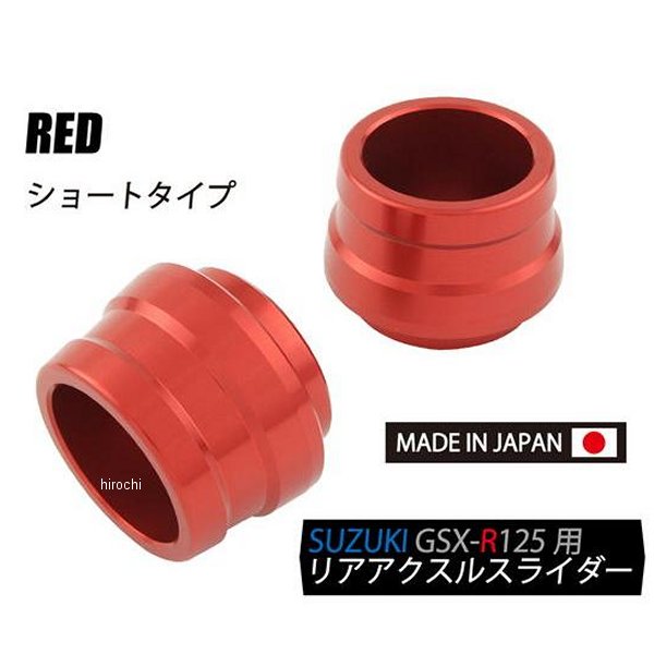 シフトアップ リアアクスルスライダー ショートタイプ M1418年-23年 スズキ GSX-R125カラー:レッドサイズ:M14アルミ2017材 削り出し/アルマイト仕上げシャフト径15mm/ナット部14mm車適合2個入り日本製【仕様説明】転倒時等にアクスルナットの破損を保護するアクスルスライダー、ドレスアップパーツとしてもご利用頂けます。