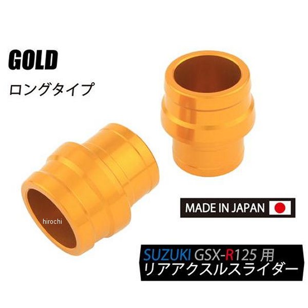 シフトアップ リアアクスルスライダー ロングタイプ M14 18年-23年 スズキ GSX-R125カラー:ゴールドサイズ:M14アルミ2017材 削り出し/アルマイト仕上げシャフト径15mm/ナット部14mm車適合2個入り日本製【仕様説明】転倒時等にアクスルナットの破損を保護するアクスルスライダー、ドレスアップパーツとしてもご利用頂けます。
