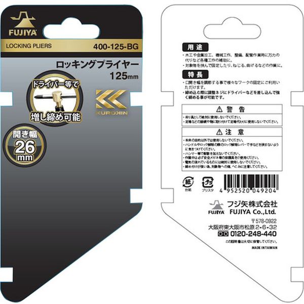・口開き幅を調整することで様々なワークの固定にご使用頂けます。・締め込む際に調整ネジにドライバーなどを差し込んで強く締めることができます。・握りこみやすく軽いリリースレバーです。・木工や金属加工、機械工作、整備、配管作業時に万力の代わりなど各種工作の補助に。・対象物を挟んで固定したり、ねじる、曲げるなどの作業に。・全長(mm):148・最大口開き(mm):26・ドライバーなどで増し締め可能・特殊鋼・吊り具として絶対に使用しないでください。・足場などの接続や物に取り付けて足場代わりに使用しないでください。・本来の目的以外では使用しないでください。・ハンドルやロック解除レバーで手などを挟まないように気を付けてください。・ハンマー等で衝撃を加えないでください。・生産国 台湾・JANコード 4952520049204・質量 182g・コード:240-2228 ・品目:400125BG
