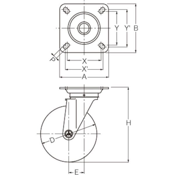 ・荷重に対する抵抗力が大きく、旋回もスムーズな高品質な大型キャスターです。・使用例 : 取付け座が大きく機械の移動や重量物運搬用として多く使用されています。・旋回部にはスチールボールが上下二段に組込まれております。・重量物運搬用として・車輪径D(mm):100・タイプ:旋回式・許容荷重(daN):120・許容荷重(kgf):122.4・車輪幅(mm):32・取付高H(mm):140・取付座A(mm):108・取付座B(mm):108・取付ピッチX(mm):70~80・取付ピッチY(mm):70~80・取付穴径P(mm):11・偏芯E(mm):35・旋回半径r(mm):86・車輪固定方法:ナット・プレート式・本体:スチール・金具表面処理:三価クロム化成処理・車輪:ウレタン・生産国 日本・JANコード 4956237034461・質量 1243g・コード:337-3125 ・品目:400SURB100