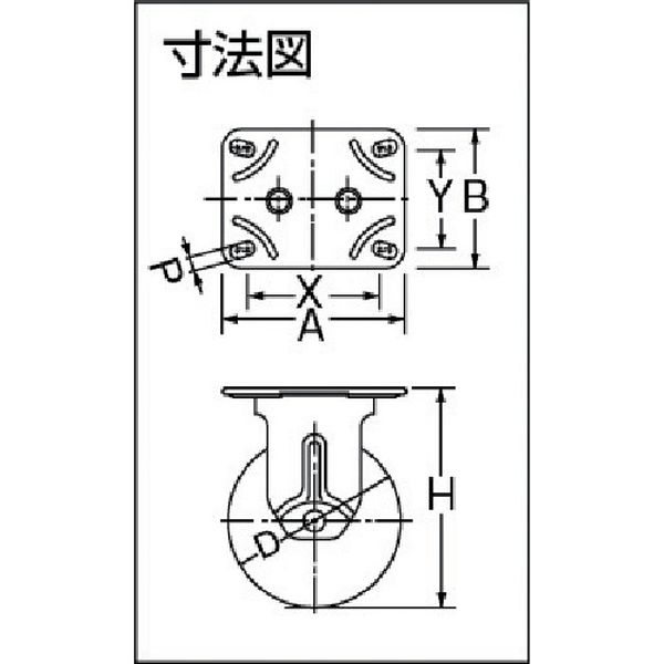 ・取付座が大きく重量感と堅牢さと安定感があります。・医療機器・理化学機器の分野で広く使用されているキャスターです。・車輪径D(mm):100・タイプ:固定式・許容荷重(daN):70・許容荷重(kgf):71.4・車輪幅(mm):32・取付高H(mm):125・取付座A(mm):105・取付座B(mm):80・取付ピッチX(mm):76~87・取付ピッチY(mm):57~60・取付穴径P(mm):8.6・許容荷重(N):700・プレート式・ラジアルボールベアリング入・固定式・金具:スチール・金具表面処理:三価クロム化成処理・車輪:ナイロンホイール、ゴム(スチール製ホイールカバー付)・生産国 日本・JANコード 4956237021706・質量 643g・コード:212-3380 ・品目:420MRRB100