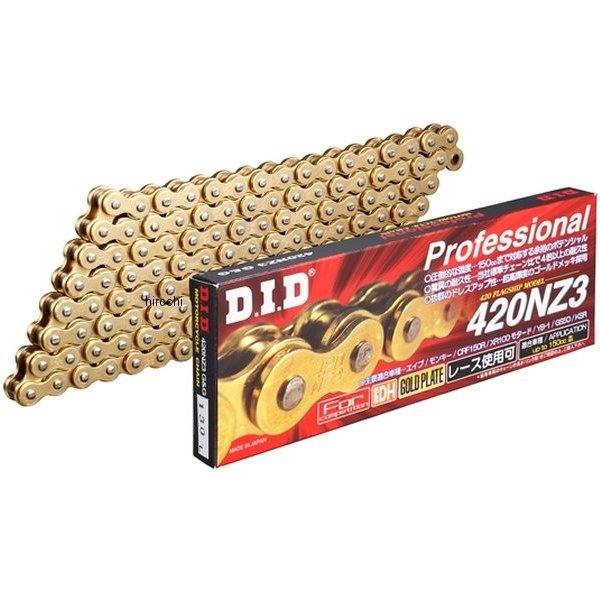 D.I.D 大同工業 チェーン 420NZ3 ノンシールシリーズチェーンサイズ:420リンク数:(96L)ジョイントタイプ:RJ(クリップ)カラー:ゴールドスタンダード420チェーンに比べ、約30%の強度アップを実現、150ccまで対応するワンクラス上の余裕の強度で、オン・オフ問わず安定した性能を発揮します。DID特許のスーパーダイハード加工を施し、ピンの表面硬度をUP、チェーンが伸びる原因の、ピンの摩耗を抑制、摩耗寿命を飛躍的に向上させました。スタンダード420D比べ、約4倍の摩耗寿命で、耐久レースでも抜群の性能を発揮します。※パッケージは予告なく変更される場合がございます。