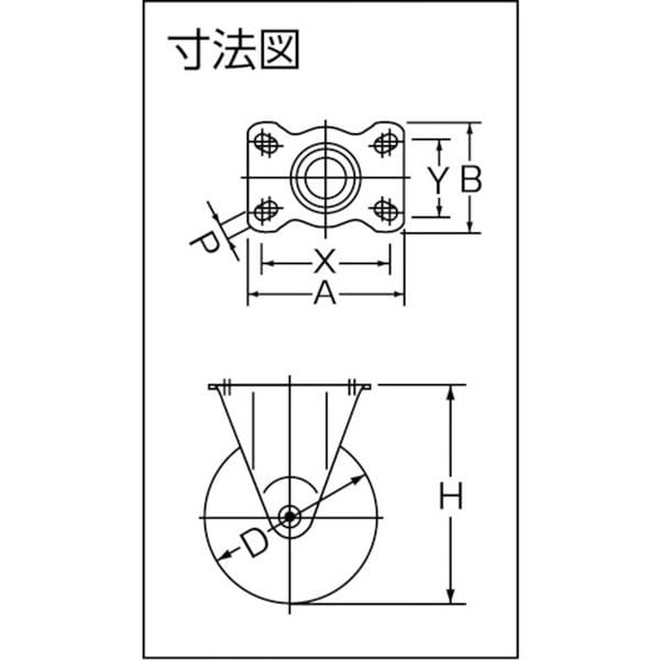 ・荷重に対する抵抗力が大きく旋回もスムーズです。・オールマイティーな中・重量用キャスターです。・車輪径D(mm):100・タイプ:固定式・許容荷重(daN):120・許容荷重(kgf):122.4・車輪幅(mm):32・取付高H(mm):132・取付座A(mm):110・取付座B(mm):78・取付ピッチX(mm):80~90・取付ピッチY(mm):45~50・取付穴径P(mm):11・プレート式・固定式・ローラーベアリング入・金具:スチール・金具表面処理:三価クロム化成処理・車輪:スチールホイール、熱硬化性ウレタン・生産国 日本・JANコード 4956237027241・質量 869g・コード:398-4940 ・品目:420SRURB100