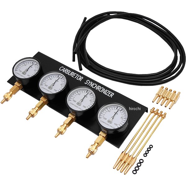 ・寸法:全長300mm×全幅150mm、ゲージ径φ65、測定範囲:?100~100kPa(10~5kPa刻み)・セット内容・本体(調整バルブ付き)・アタッチメント(真鍮製):169×φ4×4本(先端部テーパー)・アタッチメント取付ネジ寸法:M5×P0.8、M6×P0.75・ビニールホース:φ5×φ8×950×4本・Oリング(アタッチメント用):M5用・M6用×各4個※使用時は調整バルブを必ず全閉にし、エンジンを始