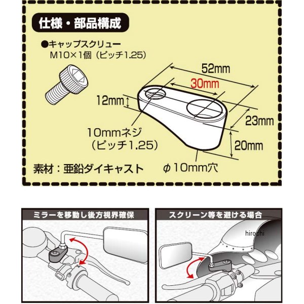 オフセットホルダーです。汎用カラー:クロームメッキネジ径:10mm P=1.25素材:亜鉛ダイキャスト芯芯ピッチ長さ:30mmミラーを見やすい位置に30mmオフセットし、後方視界確保。ミラー以外にもパーツ取付に便利な汎用ホルダー。