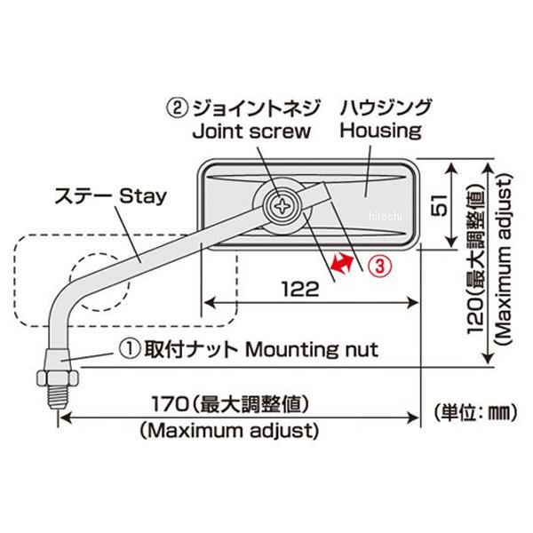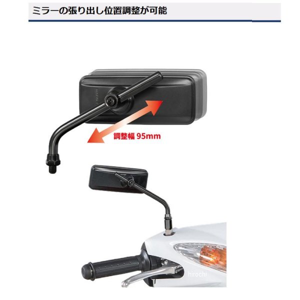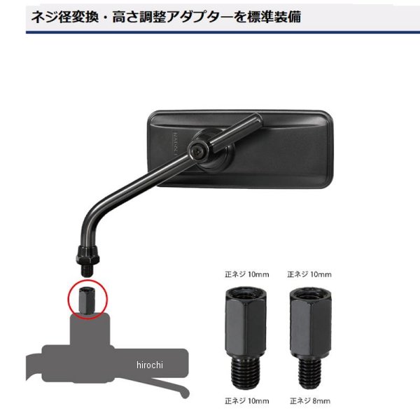 AVA-104-10 タナックス TANAX リトラミラー シルバー鏡 10mm 黒カラー:ブラック10mm正ネジ 左右共通内容:本体×1、ネジ径変換アダプター×1、高さ調整アダプター×1鏡曲率半径:R=1,000mm鏡部寸法:115×44mm原付~小排気量に最適な小型ミラー小さくても、確実な後方視界を確保する機能を搭載純正よりもワイドに見える、R1000広角ワイドミラーを採用ネジ1本でハウジングの張り出しが調整可能8ミリネジ車両や、ミラーの高さを上げたい方は付属のアダプターが便利H19年以降生産車は新保安基準非適合H18年以前生産車は保安基準適合