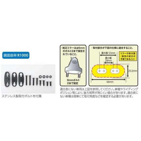 タナックス カウリングミラー12 NC-002ハイスペック・ハイエンドカウリングミラー!・防眩鏡「RAYSAVE」を採用。HID・LEDヘッドライト増加の為、防眩性能を強化!・純正より広く見えるR1000鏡。・ALL金属ボディ・主要ボルトにステンレスを採用し錆びにくくなりました。・アングルボルトが緩みにくくなりました。左右共通カウル取付専用。取付け部サイズは画像の図にてご確認ください。色:ブラック鏡:レイセーブ本体重量:596g材質:アルミダイキャスト+鉄ステー長:125mm部品構成・ミラー本体×1・スペーサー×1・パッキン×2・取付ボルト