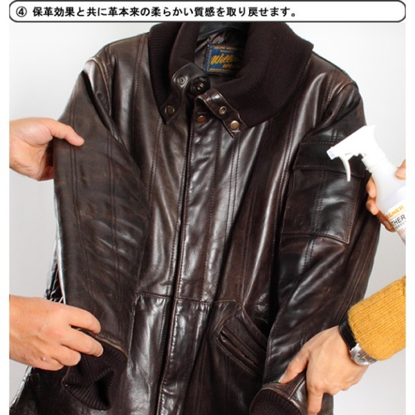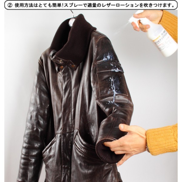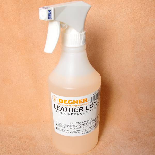 デグナー DEGNER レザーローション【使用方法】スプレーで適量のレザーローションを吹き付けます。スプレー後にレザージャケットを手または柔らかい布で揉みほぐします。革本来の柔らかい質感を取り戻します。
