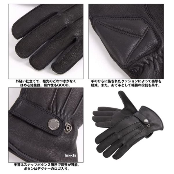 デグナー DEGNER レザーグローブカラー:ブラック サイズ:Sサイズ素材:牛革外縫い仕立てで指先のごわつきがなくはめ心地抜群。柔らかく程よい弾力のある牛革を使用。手首はスナップボタン2箇所で調整が可能。手のひらに施されたクッションによって衝撃を軽減。あて側として補強の役割も。生産時期によりボタン仕様が異なります。【注意点】経年変化やご使用による製品の劣化・損耗は避けられません。耐久性には十分考慮しておりますが、過度な負担をかけたり使用方法が適切でない場合破損する恐れがございます。同じ製品であってもそのシワやヒビの入り方にはそれぞれ個体差があり、またその革固有のキズ・色合いの濃淡など個性がございます。製作時期によっても革の風合いに若干の差異が生じることが御座いますので予めご了承くださいませ。商品の仕様等予告なく変更する場合がございます。