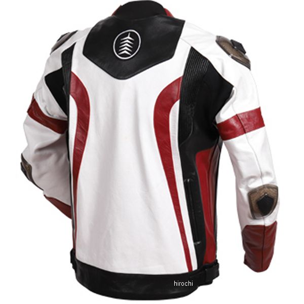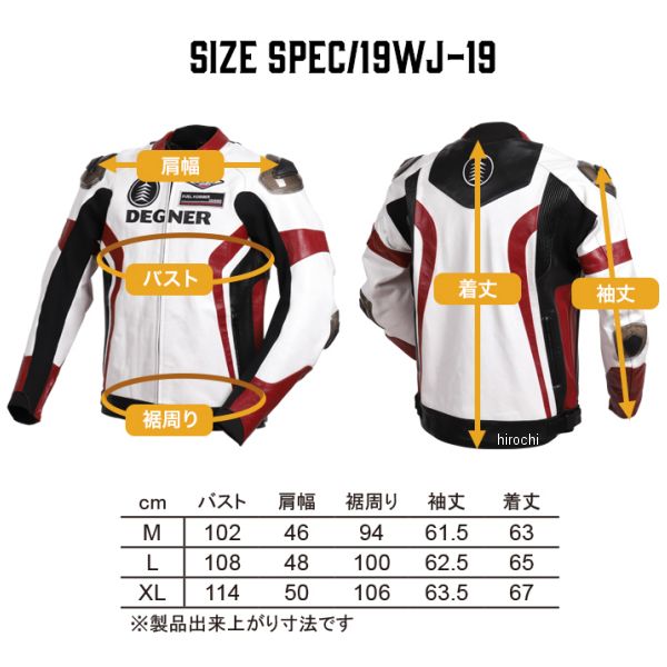 デグナー DEGNER レザーレーシングジャケットカラー:ホワイト/レッド サイズ:Lサイズ素材:牛革裏地は肌離れが良く、軽い着心地のメッシュを採用。季節におおじてインナーを調整することで長く着られる。背中内側に備えたファスナーでパンツとジャケットを接続可能。ファスナーで繋げばすり上がりを防ぎ、前傾姿勢をとっても背中が見えない。脇から袖口まで伸縮性の有るジャージ素材を使用することで、腕のフィット感を向上し曲げたときの負担を軽減。前傾姿勢で負担になりやすい手首部分は、柔らかなジャージ素材で負担を軽減。しなやかに首周りにフィットし走行時の首が窮屈にならず、快適な着心地。方の後ろのシャーリングと脇のジャージ素材は腕を前に出し前傾姿勢となるライディングポジションでも動きやすく、腕の疲労感を軽減。暑い日や汗を書いたあとなど腰のベンチレーションを開ければジャケット内の熱気を放出。ウエストはベルトで調整可能。肩と肘には樹脂製のアウタープロテクターを装備肩、ひじ、背中、胸には取外し可能なCE規格レベル2対応のプロテクター。【注意点】経年変化やご使用による製品の劣化・損耗は避けられません。耐久性には十分考慮しておりますが、過度な負担をかけたり使用方法が適切でない場合破損する恐れがございます。同じ製品であってもそのシワやヒビの入り方にはそれぞれ個体差があり、またその革固有のキズ・色合いの濃淡など一着一着に個性がございます。製作時期によっても革の風合いに若干の差異が生じることが御座いますので予めご了承くださいませ。商品の仕様等予告なく変更する場合がございます。
