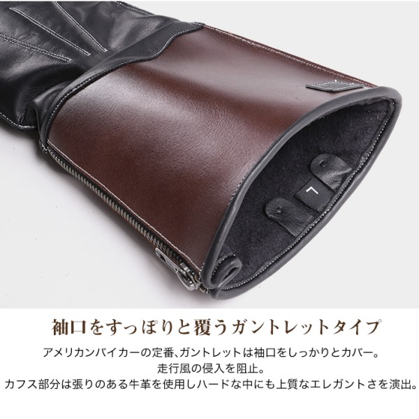 デグナー DEGNER ガントレットレザーグローブカラー:ブラック/ブラウン サイズ:Mサイズ素材:牛革ガントレットは袖口をしっかりとカバー。走行風の侵入を阻止。カフス部分は張りのある牛革を使用しハードな中にも上質なエレガントさを演出。履き口がファスナーが大きく開くので袖を覆いやすく着脱も簡単。長く使っていただけるよう、手のひらにあて革を施し耐久性をアップ。縫い目が指に当たらず、操作性を向上する外縫い仕様。【注意点】商品の仕様等予告なく変更する場合がございます。
