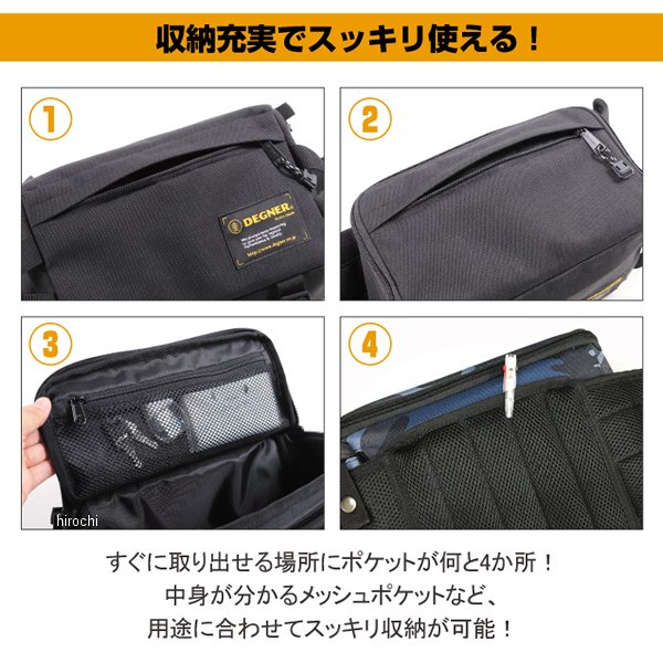 デグナー DEGNER ヒップバッグカラー:ブラック 素材:ポリエステルサイズ:縦20cm×横28cm×厚み15cmウエストベルト 最長135cm見た目以上に荷物が入る5.5リットルの四角いボディ。メイン収納部分は1室タイプで大きな荷物もすっぽり収納。ポケットが4カ所メイン収納部には小物を分ける便利なポケット付。紛失しやすい鍵などをかけておけるフックを装備。身体側から開くフラップで荷物が落ちにくい。荷物が少ないときにはアンダーアジャスターを引くことで本体の余った容量をスリム化できる。サイドアジャスターを引くことで中で荷物が動きバタつくのを抑える。体に当たる部分にはクッション性があるメッシュ素材で不快なムレを軽減。余ったベルトをまとめる面テープつき。【注意点】長時間の紫外線照射による生地の退色は避けられません。商品の仕様等予告なく変更する場合がございます。