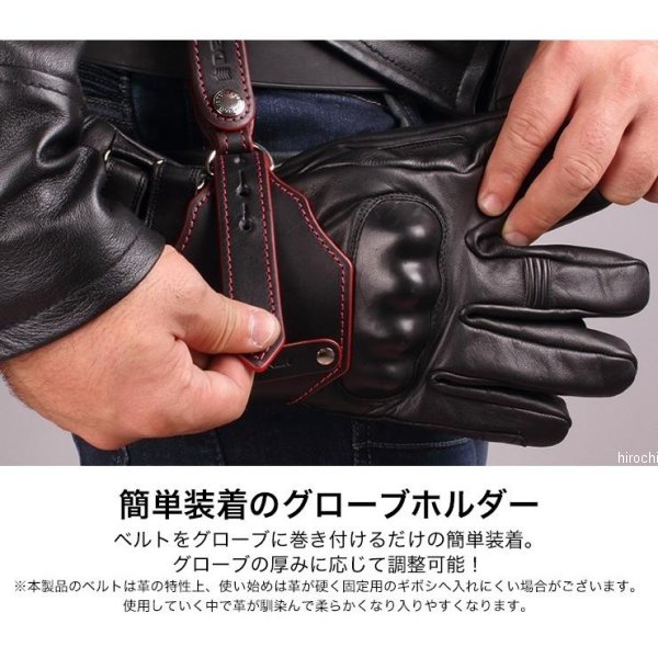 デグナー DEGNER レザーグローブホルダーカラー:ブラック/レッド 素材:牛革(天然タンニンなめし)サイズ:幅 8.5cm ※有効内寸:14~25cmベルトをグローブに巻きつけるだけの簡単装着。グローブの厚みに応じて調整可能。有効内寸は最大25cm【注意点】経年変化やご使用による製品の劣化・損耗は避けられません。製作時期によっても革の風合いに若干の差異が生じることが 御座いますので予めご了承くださいませ。商品の仕様等予告なく変更する場合がございます。