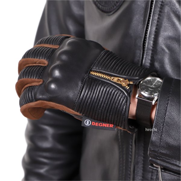 デグナー DEGNER レザーグローブ シャーリング プロテクターカラー:ブラック/ブラウン サイズ:Lサイズ素材:牛革手の甲全体に配したシャーリングが指の動きをサポート。カフスの長さを手首までのショート丈にしたことで腕時計に干渉しにくい。革張りで見た目を損なわないナックルプロテクターを装備。摩耗しやすい手のひらは革やプロテクターで補強。グローブの着脱がしやすいロック式ファスナー。二土佐市指と親指にタッチスクリーン対応素材を使用。【注意点】お使いの保護フィルムと相性が悪く、スマホタッチが反応しない場合がございます。同じ製品であってもそのシワやヒビの入り方にはそれぞれ個体差があり、またその革固有のキズ・色合いの濃淡なども個性がございます。製作時期によっても革の風合いに若干の差異が生じることがございます。予めご了承ください。経年変化やご使用による製品の劣化・損耗は避けられません。耐久性には十分考慮しておりますが、過度な負担をかけたり使用方法が適切でない場合破損する恐れがございます。薄い色の衣服と合わせて着用された時、雨・汗などでの湿り、摩擦などからの刺激で色移りすることがございますので、ご注意ください。商品の仕様等予告なく変更する場合がございます。【お手入れ方法】汗や雨等で濡れてしまった後は、風通しのよい日陰で乾燥させ、レザーオイルで保湿してください。レザーオイルの塗りすぎは革が弱くなってしまい、カビ等の原因となりやすい為、塗りすぎないよう、薄く塗布してください。長期の保管前には、革製品のクリーニング等もオススメです。