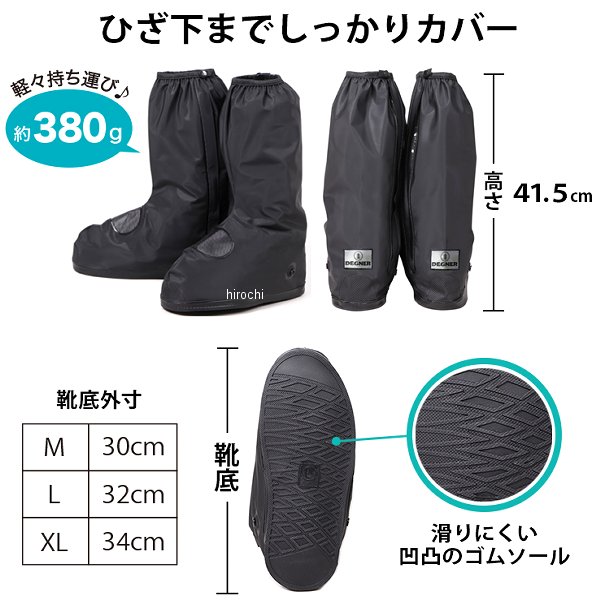 デグナー DEGNER レインシューズカバーカラー:ブラック サイズ:XLサイズ素材:PVC靴底外寸:34cm付属のゴムベルトでバタつき防止シフトチェンジによる劣化を軽減するガード付きリフレクターで視認性アップ大きく開口し、かんたん着脱【注意点】主にオフロード走行用など、滑り止めの金属製の尖った形状のステップをご使用の場合、本製品のソールに穴が開く恐れがございます。ラバーで保護されていない状態での本製品のご使用はお控えください。ご使用後はしっかり水を切り、乾かしてから保管してください。耐久性には十分考慮しておりますが、過度な負担をかけたり 使用方法が適切でない場合破損する恐れがございます。熱くなったエンジン、マフラー、チャンバーなどに接すると溶けたり 穴が開いたりする恐れがございます。ご注意ください。商品の仕様等予告なく変更する場合がございます。