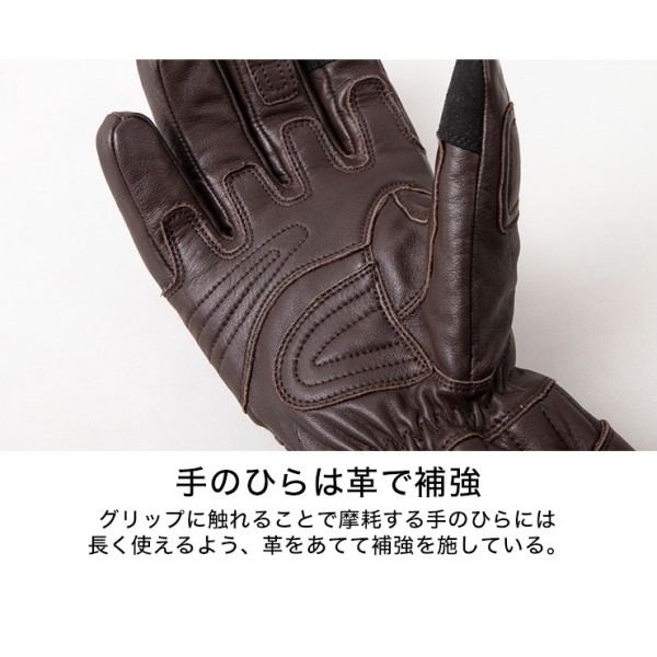デグナー DEGNER レザーグローブカラー:ブラウン サイズ:XLサイズ素材:牛革、透湿防水フィルム手の甲にはプロテクターを装備。グリップで摩耗しやすい手のひらは革で補強。手の甲側のインナーはボア素材、手のひら側のインナーはポリエステル生地を使用。手首のベルトを絞れば風の侵入を防止。面ファスナー式のベルトで着脱もラクラク。親指と人差指にタッチスクリーン対応素材を採用。グローブ裾にあしらわれたスエードレザーはクラシカル&クールなワンポイント。【注意点】お使いの保護フィルムと相性が悪く、スマホタッチが反応しない場合がございます。経年変化やご使用による製品の劣化・損耗は避けられません。耐久性には十分考慮しておりますが、過度な負担をかけたり使用方法が適切でない場合破損する恐れがございます。同じ製品であってもそのシワやヒビの入り方にはそれぞれ個体差があり、またその革固有のキズ・色合いの濃淡など個性がございます。製作時期によっても革の風合いに若干の差異が生じることが御座いますので予めご了承くださいませ。商品の仕様等予告なく変更する場合がございます。