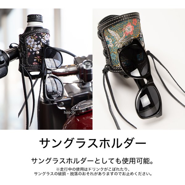 デグナー DEGNER 花山ドリンクホルダーカラー:ブラック 京桜素材:牛革(天然タンニンなめし)/金襴織物付属品:結束バンド 2本最大500mlのペットボトル対応【注意点】本品はバイクの駐停車時に缶コーヒーから500mlペットボトルまで収納できます。サングラスホルダーとしても利用できます。走行中の使用はドリンクがこぼれたり、サングラスの破損・脱落のおそれがありますのでお止めください。万一サングラスが破損・脱落しても補償いたしかねます。経年変化やご使用による製品の劣化・損耗は避けられません。耐久性には十分考慮しておりますが、過度な負担をかけたり使用方法が適切でない場合破損する恐れがございます。同じ製品であってもそのシワやヒビの入り方にはそれぞれ個体差があり、またその革固有のキズ・色合いの濃淡など一つ一つに個性がございます。製作時期によっても革の風合いに若干の差異が生じることが御座いますので予めご了承くださいませ。商品の仕様等予告なく変更する場合がございます。
