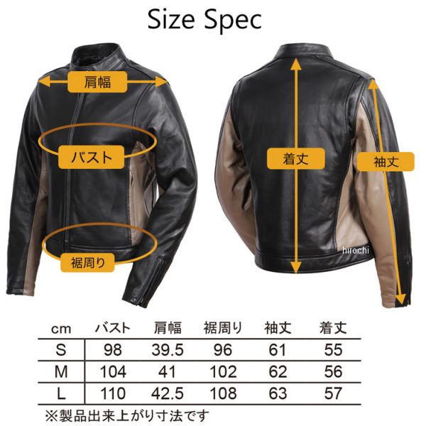 デグナー DEGNER バイカラーレディースレザージャケットカラー:ベージュ サイズ:Lサイズ素材:羊革裾から脇、袖までつながるバイカラーのラインが身体のラインをスッキリ見せ美しく女性らしさを演出。スッキリとしたシングルライダース。肩、肘、背中に加え胸にもプロテクターを標準装備。方の後ろにはアクションプリーツを配置し乗車時の腕の動きをサポート。袖口には着脱しやすいようにファスナーを設けた。【注意点】同じ製品であってもそのシワやヒビの入り方にはそれぞれ個体差があり、またその革固有のキズ・色合いの濃淡なども個性がございます。製作時期によっても革の風合いに若干の差異が生じることがございます。予めご了承ください。経年変化やご使用による製品の劣化・損耗は避けられません。耐久性には十分考慮しておりますが、過度な負担をかけたり使用方法が適切でない場合破損する恐れがございます。薄い色の衣服と合わせて着用された時、雨・汗などでの湿り、摩擦などからの刺激で色移りすることがございますので、ご注意ください。商品の仕様等予告なく変更する場合がございます。【お手入れ方法】汗や雨等でジャケットが濡れてしまった後は、風通しのよい日陰で乾燥させ、レザーオイルで保湿してください。レザーオイルの塗りすぎは革が弱くなってしまい、カビ等の原因となりやすい為、塗りすぎないよう、薄く塗布してください。長期の保管前には、革製品のクリーニング等もオススメです。