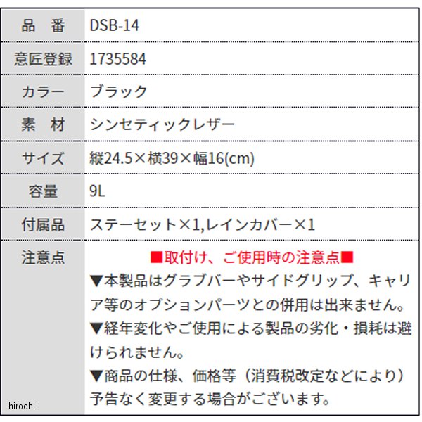 デグナー DEGNER Z900RS専用 シンセティックレザーサドルバッグ18年-20年 カワサキ Z900RS、Z900RS Cafe、Z900RS SE※50thアニバーサーリモデル、カスタム車両は不適合。カラー:ブラック 素材:シンセティックレザーサイズ:縦24.5cm×横39cm×厚み16cm容量9リットル付属品:ステーセット、レインカバー車体側に必要なパーツを最低限にし、サドルバッグ側にサポートステーを装着することで、バッグを取り外したときにステーが車体側に残らない。【注意点】本製品はグラブバーやサイドグリップ、キャリア等のオプションパーツとの併用は出来ません。経年変化やご使用による製品の劣化・損耗は避けられません。商品の仕様等予告なく変更する場合がございます。