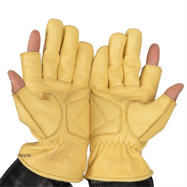 デグナー DEGNER フィンガーレス レザーグローブカラー:タン サイズ:XLサイズ素材:牛革親指と人差指の指先をなくした斬新なデザインでスマートフォンを操作しやすく、細かな作業も行いやすい。手のひらはあて革とクッションを配置。指先に縫い目が当たらない外縫い仕様。手首部分はボタン式で着脱やサイズ調整が簡単にできる仕様。【注意点】経年変化やご使用による製品の劣化・損耗は避けられません。耐久性には十分考慮しておりますが、過度な負担をかけたり使用方法が適切でない場合破損する恐れがございます。同じ製品であってもそのシワやヒビの入り方にはそれぞれ個体差があり、またその革固有のキズ・色合いの濃淡など個性がございます。製作時期によっても革の風合い、色味に若干の差異が生じることが御座いますので予めご了承くださいませ。商品の仕様等予告なく変更する場合がございます。