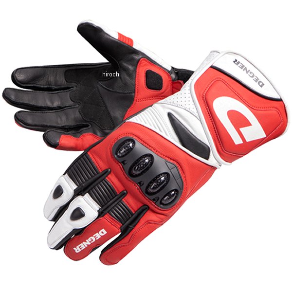 デグナー DEGNER レーシンググローブカラー:ホワイト/レッド サイズ:Lサイズ素材:やぎ革/牛革ナックル部分にハードプロテクターを配置。フローティング構造のナックルプロテクターはより自然なフィット感を生み出し操作性を向上。手の甲、指、手のひら、手首にソフトプロテクターを装備。親指、人差し指、中指、薬指にシャーリングを施し指の曲げ伸ばしをサポート。手首部分は2本の面ファスナーで着脱やサイズ調整が簡単にできる仕様。縫い目が当たらない外縫い仕様。手のひらはあて革で補強。【注意点】経年変化やご使用による製品の劣化・損耗は避けられません。耐久性には十分考慮しておりますが、過度な負担をかけたり使用方法が適切でない場合破損する恐れがございます。同じ製品であってもそのシワやヒビの入り方にはそれぞれ個体差があり、またその革固有のキズ・色合いの濃淡など個性がございます。製作時期によっても革の風合い、色味に若干の差異が生じることが御座いますので予めご了承くださいませ。商品の仕様等予告なく変更する場合がございます。