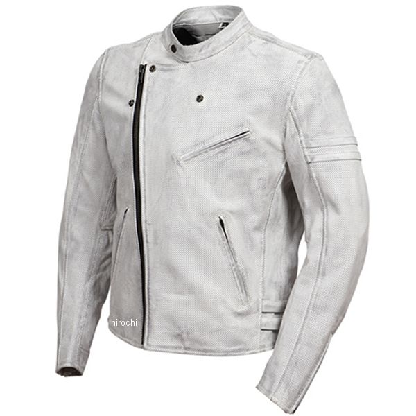 デグナー DEGNER メッシュレザージャケットカラー:ホワイト サイズ:Lサイズ素材:牛革(ワックス加工)本革のメッシュレザーを使用した涼しくて快適なレザージャケット。ファスナーの開閉具合によってダブルライダースとしても使い分け可能。肩・ヒジ・胸・背中に着脱可能なプロテクターを標準装備。袖口はファスナー仕様でグローブに合わせて調節可能。アクションプリーツを配置することで肩周りが動かしやすくなりライディング時の負荷を軽減。【注意点】同じ製品であってもそのシワやヒビの入り方にはそれぞれ個体差があり、またその革固有のキズ・色合いの濃淡なども個性がございます。製作時期によっても革の風合いに若干の差異が生じることがございます。予めご了承ください。経年変化やご使用による製品の劣化・損耗は避けられません。耐久性には十分考慮しておりますが、過度な負担をかけたり 使用方法が適切でない場合破損する恐れがございます。薄い色の衣服と合わせて着用された時、雨・汗などでの湿り、摩擦などからの刺激で色移りすることがございますので、ご注意ください。商品の仕様等予告なく変更する場合がございます。【お手入れ方法】汗や雨等でジャケットが濡れてしまった後は、風通しのよい日陰で乾燥させ、レザーオイルで保湿してください。レザーオイルの塗りすぎは革が弱くなってしまい、カビ等の原因となりやすい為、塗りすぎないよう、薄く塗布してください。長期の保管前には、革製品のクリーニング等もオススメです。