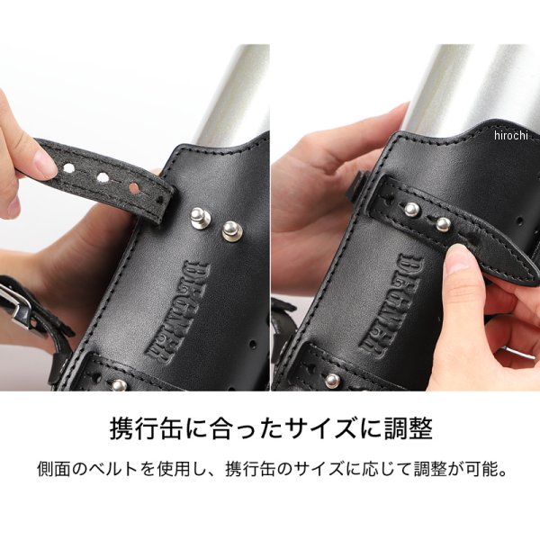 デグナー DEGNER ガソリン携行缶ホルダーカラー:ブラック/クロコブラック 素材:牛革(天然タンニンなめし)サイズ:高さ 20~28cm×内径7.5~9.4cm ※有効内寸付属品:結束バンド 2本、脱落防止ヒモ【注意点】携行缶は別売りです。経年変化やご使用による製品の劣化・損耗は避けられません。耐久性には十分考慮しておりますが、過度な負担をかけたり使用方法が適切でない場合破損する恐れがございます。同じ製品であってもそのシワやヒビの入り方にはそれぞれ個体差があり、またその革固有のキズ・色合いの濃淡なども個性がございます。製作時期によっても革の風合いに若干の差異が生じることが御座いますので、予めご了承くださいませ。商品の仕様等予告なく変更する場合がございます。