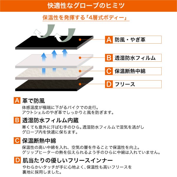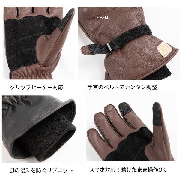 デグナー DEGNER レザーグローブサイズ:XLカラー:ブラウン素材:やぎ革、透湿防水フィルム、保温断熱中綿【仕様説明】手の甲のソフトプロテクターは、見た目を損なわないようソフトタイプのものを内蔵装備。親指と人差し指に、タッチスクリーン素材を採用。手のひら側は、摩擦しやすい部分に革をあてて補強。裏地を薄くすることでグリップヒーターにも対応。手首のフィット感は、ベルトで簡単調整、フィット感を高め、保温性をしっかり確保。手首はフィット感の良いリブニットを使用。冷たい風の侵入も防ぎ、しっかり保温。明るい色のアイボリーはヴィンテージ感を高めるワックス加工を施し、使い込んだ風合いに仕上げました。※注意点・お使いの保護フィルムと相性が悪く、スマホタッチが反応しない場合がございます。・経年変化やご使用による製品の劣化・損耗は避けられません。・耐久性には十分考慮しておりますが、過度な負担をかけたり使用方法が適切でない場合破損する恐れがございます。・同じ製品であってもそのシワやヒビの入り方にはそれぞれ個体差があり、またその革固有のキズ・色合いの濃淡など個性がございます。・製作時期によっても革の風合いに若干の差異が生じることが御座いますので予めご了承くださいませ。・商品の仕様、価格等(消費税改定などにより)予告なく変更する場合がございます。