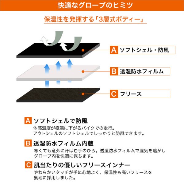 デグナー DEGNER ソフトシェルグローブ レディースサイズ:Mカラー:グレー素材:ポリエステル(ソフトシェル)、やぎ革、透湿防水フィルム【仕様説明】軽く柔らかいソフトシェル素材を使用。通気性・透湿性に優れ、蒸れにくく、体の冷えを軽減します。グローブの内部は、フリースを使用。肌触りがよく温かいです。手の甲のプロテクターは、見た目を損なわないようソフトタイプのものを内蔵装備。掌側は、摩擦のしやすい部分に革を当てて補強。裏地を薄くすることでグリップヒーターにも対応。手首はフィット感を向上させるシャーリング仕様。冷たい風の侵入も防ぎ、しっかり保温。親指、人差し指にはタッチスクリーン対応素材を採用。グローブを外すことなくスマホなどの操作が可能です。※注意点・お使いの保護フィルムと相性が悪く、スマホタッチが反応しない場合がございます。・経年変化やご使用による製品の劣化・損耗は避けられません。・耐久性には十分考慮しておりますが、過度な負担をかけたり使用方法が適切でない場合破損する恐れがございます。・同じ製品であってもそのシワやヒビの入り方にはそれぞれ個体差があり、またその革固有のキズ・色合いの濃淡など個性がございます。・製作時期によっても革の風合いに若干の差異が生じることがございますので予めご了承くださいませ。・商品の仕様、価格等(消費税改定などにより)予告なく変更する場合がございます。