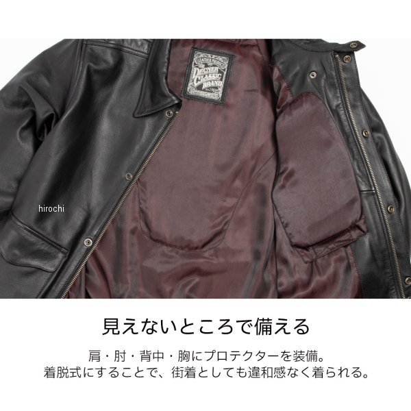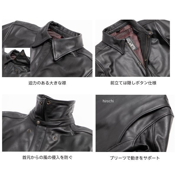 デグナー DEGNER レザーA-2ジャケットサイズ:Lカラー:ブラック素材:牛革 標準装備プロテクター:肩、肘、背、胸【仕様説明】台襟があり、高さがある大きな襟。走行時にバタつかないよう、ボタンで固定が可能。寒さを感じやすい首元からの風の侵入を防ぎ、グローブを装着したままでも締められるボタン式。プロテクターは着脱式。街着としても違和感なく着られます。袖と裾まわりのリブニットで身体にフィット。冷たい風の侵入を防ぎ、冬の走行も暖かく。前立てには、隠しボタンを配置。背中にはアクションプリーツを配置。ライディングポジションでも動きやすいよう配慮。【お手入れ方法】汗や雨等でジャケットが濡れてしまった後は、風通しのよい日陰で乾燥させ、レザーオイルで保湿してください。レザーオイルの塗りすぎは革が弱くなってしまい、カビ等の原因となりやすい為、塗りすぎないよう、薄く塗布してください。長期の保管前には、革製品のクリーニング等もオススメです。※取付け、ご使用時の注意点・同じ製品であってもそのシワやヒビの入り方にはそれぞれ個体差があり、またその革固有のキズ・色合いの濃淡なども個性がございます。・製作時期によって風合いに若干の差異が生じることがございます。予めご了承ください。・経年変化やご使用による製品の劣化、損耗は避けられません。・耐久性には十分考慮しておりますが、過度な負担をかけたり 使用方法が適切でない場合破損する恐れがございます。・薄い色の衣服と合わせて着用された時、雨・汗などでの湿り、摩擦などからの刺激で色移りすることがございますので、ご注意ください。・商品の仕様等予告なく変更する場合がございます。