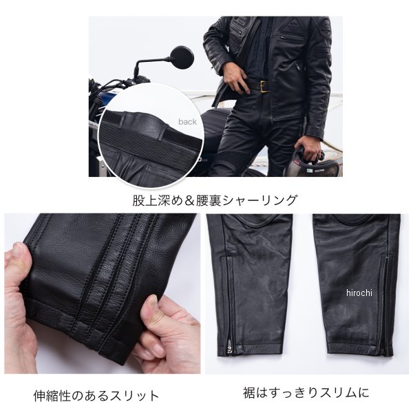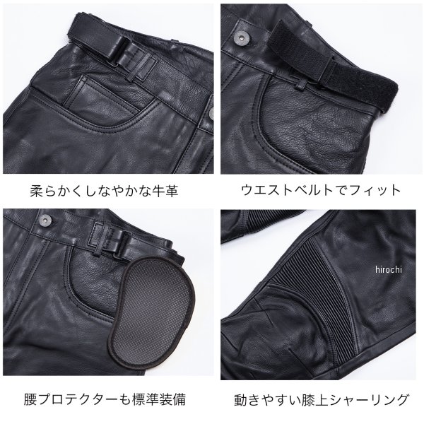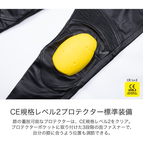 デグナー DEGNER メンズ プロテクター付き レザーパンツサイズ:Sカラー:ブラック素材:牛革 標準装備プロテクター:膝、腰【仕様説明】堅牢な牛革ながらも、柔らかくしなやかな履き心地。裾を細くしたことで、ブーツにスッキリ収まります。脱ぎ履きに便利な裾ファスナー付き。ふくらはぎには伸縮性のあるスリット入り。脱ぎ履きしやすく、フィット感も抜群。膝の着脱可能なプロテクターは、CE規格レベル2をクリア。プロテクターポケットに取り付けた3段階の面ファスナーで、自分の膝に合うよう位置も調節できる。深めの股上と腰裏のシャーリングが、姿勢をサポートし超時間のライディングでも疲れにくいです。膝上にもシャーリング加工を施しました。膝を曲げても突っ張りにくく、動きやすいです。腰には面ファスナー式のアジャストベルトを配置。お好みのフィット感に調節可能。※注意点・経年変化やご使用による製品の劣化・損耗は避けられません。・耐久性には十分考慮しておりますが、過度な負担をかけたり使用方法が適切でない場合破損する恐れがございます。・同じ製品であってもそのシワやヒビの入り方にはそれぞれ個体差があり、またその革固有のキズ・色合いの濃淡など一着一着に個性がございます。・製作時期によっても革の風合いに若干の差異が生じることが御座いますので予めご了承くださいませ。・商品の仕様等予告なく変更する場合がございます。