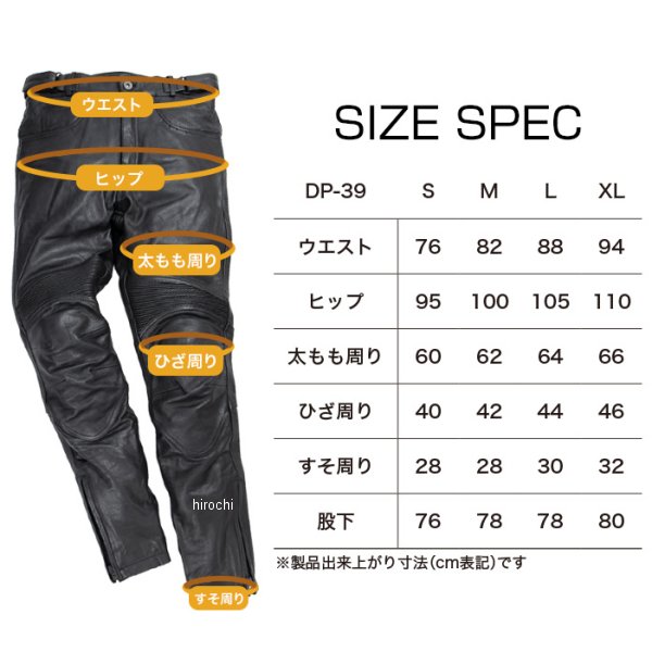 デグナー DEGNER メンズ プロテクター付き レザーパンツサイズ:Lカラー:ブラック素材:牛革 標準装備プロテクター:膝、腰【仕様説明】堅牢な牛革ながらも、柔らかくしなやかな履き心地。裾を細くしたことで、ブーツにスッキリ収まります。脱ぎ履きに便利な裾ファスナー付き。ふくらはぎには伸縮性のあるスリット入り。脱ぎ履きしやすく、フィット感も抜群。膝の着脱可能なプロテクターは、CE規格レベル2をクリア。プロテクターポケットに取り付けた3段階の面ファスナーで、自分の膝に合うよう位置も調節できる。深めの股上と腰裏のシャーリングが、姿勢をサポートし超時間のライディングでも疲れにくいです。膝上にもシャーリング加工を施しました。膝を曲げても突っ張りにくく、動きやすいです。腰には面ファスナー式のアジャストベルトを配置。お好みのフィット感に調節可能。※注意点・経年変化やご使用による製品の劣化・損耗は避けられません。・耐久性には十分考慮しておりますが、過度な負担をかけたり使用方法が適切でない場合破損する恐れがございます。・同じ製品であってもそのシワやヒビの入り方にはそれぞれ個体差があり、またその革固有のキズ・色合いの濃淡など一着一着に個性がございます。・製作時期によっても革の風合いに若干の差異が生じることが御座いますので予めご了承くださいませ。・商品の仕様等予告なく変更する場合がございます。