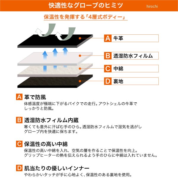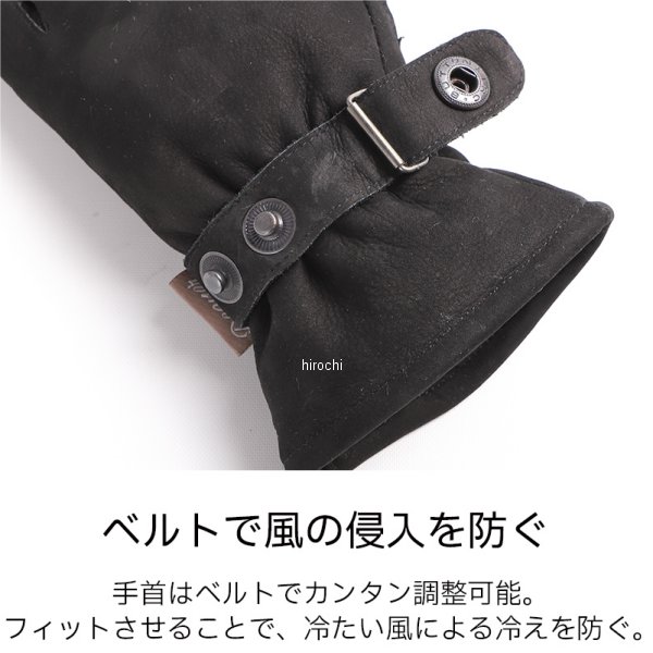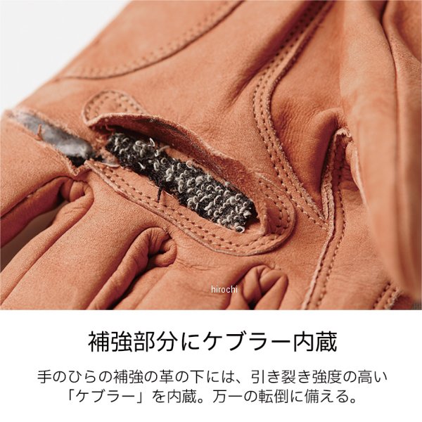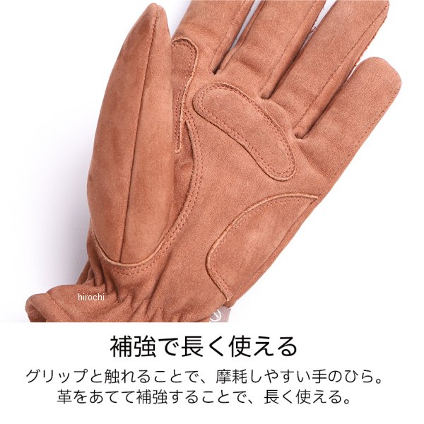 デグナー DEGNER レザーグローブ レディースサイズ:Mカラー:キャメル素材:牛革、透湿防水フィルム、保湿断熱中綿【仕様説明】グローブには、起毛したヌバックを使用することで、手に馴染みやすく、寒い時期の肌あたりも優しいです。グリップと触れることで摩擦しやすい掌は革を当てて補強したことで長く使えます。手首にはベルトで簡単調節可能。フィットさせることで、冷たい風による冷えを防ぎます。掌の補強の革の下には引き裂き強度の高いケブラーを内蔵し万一の転倒に備えています。※取付け、ご使用時の注意点・同じ製品であってもそのシワやヒビの入り方にはそれぞれ個体差があり、またその革固有のキズ、色合いの濃淡なども個性がございます。・製作時期によっても革の風合いに若干の差異が生じることがございます。予めご了承ください。・経年変化やご使用による製品の劣化・損耗は避けられません。・耐久性には十分考慮しておりますが、過度な負担をかけたり 使用方法が適切でない場合破損する恐れがございます。・薄い色の衣服と合わせて着用された時、雨・汗などでの湿り、摩擦などからの刺激で色移りすることがございますので、ご注意ください。・商品の仕様等予告なく変更する場合がございます。