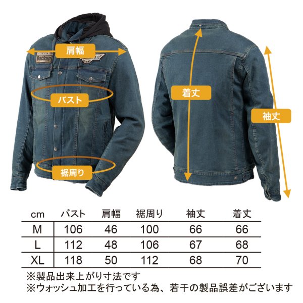 デグナー DEGNER 春夏モデル フード付きデニムジャケットサイズ:Mカラー:ヴィンテージネイビー素材:ストレッチデニム、ジャージ素材柔らかく伸びて心地よくフィットするストレッチデニムを使用したバイクのためのGジャン。ヒートガードデニムパンツ(DP-27V)とセットアップが可能に。フードは取り外し可能で2wayで楽しめます。肩・ひじ・背中・胸が標準装備しているので安心。アクションプリーツや袖口ファスナー等、ライディングのための快適な機能が充実。【ご使用時の注意点】製作時期によっても風合いに若干の差異が生じることがございます。予めご了承ください。経年変化やご使用による製品の劣化・損耗は避けられません。耐久性には十分考慮しておりますが、過度な負担をかけたり 使用方法が適切でない場合破損する恐れがございます。薄い色の衣服と合わせて着用された時、雨・汗などでの湿り、摩擦などからの刺激で色移りすることがございますので、ご注意ください。